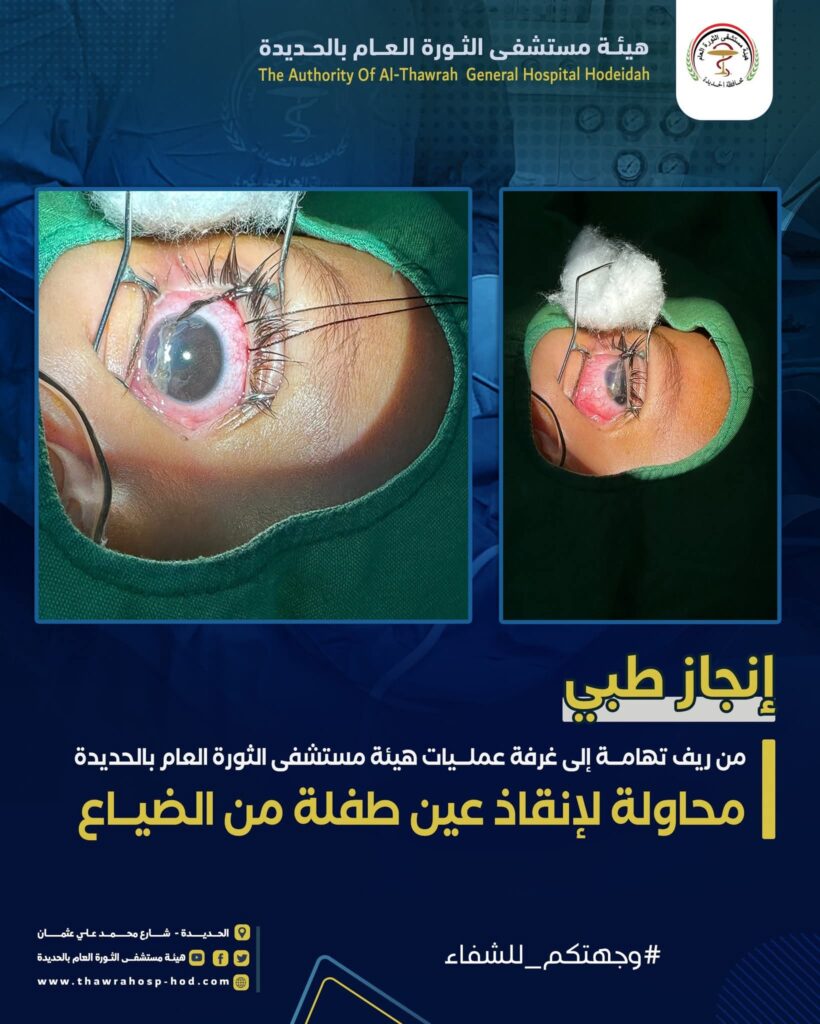 هيئة مستشفى الثورة بالحديدةفي هيئة مستشفى الثورة بمحافظة الحديدة لا يعرف الضمير سباتاً ولا تخضع الرحمة لمواعيد محددة .. هنا تستنفر همم الفرق الطبية مع كل نداء استغاثة ويحشد الأمل مع كل طارئ يطرق أبواب مراكز الطوارئ بالهيئة.في مساء يوم أمس الأربعاء استقبلت الهيئة حالة طارئة لطفلة لم تبلغ عامها الثاني بعد قدمت من إحدى قرى ريف تهامة وقد أصيبت إصابة بالغة في عينها اليمنى إثر حادث عرضي مؤلم ..