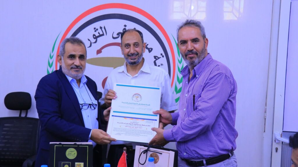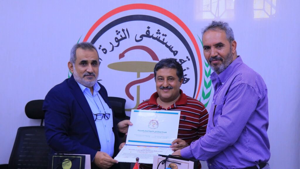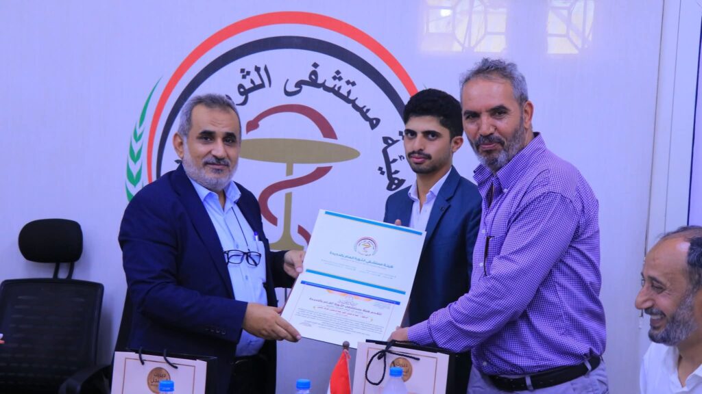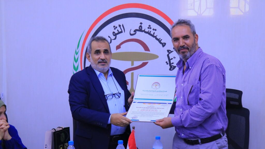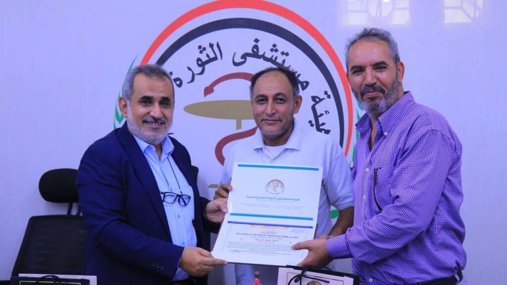 :كرمت هيئة مستشفى الثورة العام بمحافظة الحديدة اليوم الفريق الطبي الجراحي المتخصص في جراحة القلب والأوعية الدموية، تقديراً لدوره البارز في إنجاح أولى عمليات تدشين جراحة القلب المفتوح في المستشفى ولأول مرة في تاريخ المحافظة.وضم الفريق الجراحي بقيادة استشاري جراحة القلب والأوعية الدموية الدكتور نبيل المضواحي نخبة من استشاريي جراحة القلب والأوعية الدموية، وأطباء التخدير، والرعاية التنفسية، والتروية القلبية، وفنيي العمليات القلبية، وهيئة التمريض، بإجمالي 18 عضواً، شاركوا في إنجاز عدد من العمليات الدقيقة بنجاح كامل منذ تدشين الخدمة في المستشفى.