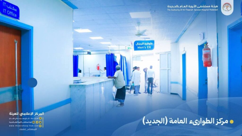 تمّ بفضل الله، ثم بالدعم السخي الذي قدّمته وزارة الصحة والبيئة ممثّلةً بمعالي الأستاذ الدكتور/ علي شيبان، وزير الصحة والبيئة، شهد مركز الطوارئ العامة بهيئة مستشفى الثورة العام بالحديدة توسعة نوعية جديدة تواكب المعايير الحديثة لمراكز الطوارئ، وتسهم في تعزيز الجاهزية والاستجابة السريعة للحالات الطارئة على مدار الساعة. وقد تجسّد هذا الدعم الكريم بتوفير أجهزة ومستلزمات طبية حديثة خاصة بالطوارئ، بقيمة 27 مليون ريال تقريباً، ساهمت بشكل مباشر في رفع كفاءة الأداء الطبي وجودة الخدمات المقدّمة للمرضى.